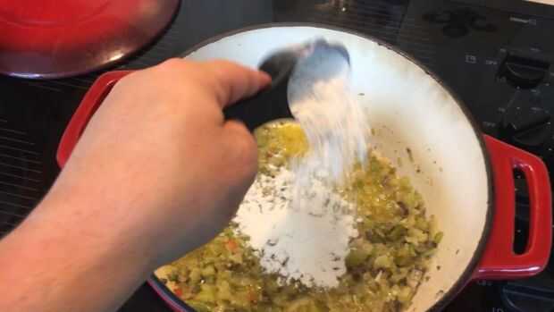 1/2 palillo (1/4 taza) mantequilla hasta que derrita y agregar 1/4 taza de harina para hacer el roux, revolviendo continuamente durante unos 2 o 3 minutos