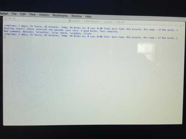 La interfaz de "humana" puede ser accedidos (Bluetooth o cable físico) con cualquier software de emulación de terminal, incluyendo monitor serial de la Arduino IDE. Al conectar por primera vez, no hay ninguna respuesta, pero la tecla presiona "u" (para "actualizar") y "t" (para la "prueba"), encontrará la salida que se muestra en la pantalla. "m" ("monitor") y "s" ("sys check") que usted consiga los mismos datos pero en un formato mucho menos legible. Estos van a "raspar" por otro programa para la visualización automática. Armé un script en Python que hace justamente eso. Cualquier otra tecla recibe el mensaje de error aparecido.