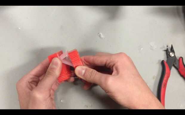 Una vez que haya curado del silicón, nosotros podemos demold el elenco. Quite las abrazaderas y utilice unas pinzas para sacar las dos partes del molde aparte. Quiere tirar el molde superior primero. Una vez que la parte superior, tirar de las piernas de la Crawli hasta que sale de la otra parte. Utilice las tijeras al ras para limpiar cualquier flash.