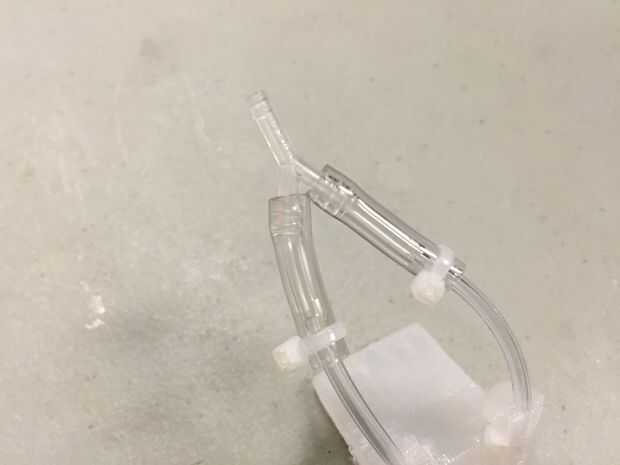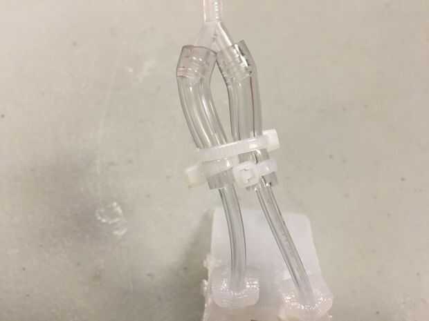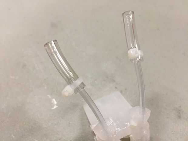 Ahora que está fuera del molde, podemos conectar la tubería. Insertar longitudes cortas de la 1/16 de pulgada de la tubería en las aberturas de las piernas. Ponga zip-alrededor de los puntos de encuentro entre la tubería y el Crawli, como se muestra en la imagen. A continuación, conecte longitudes cortas de 1/8" tubo 1/16" tubo empujando el 1/16 de pulgada de la tubería en 1/8" tubería. Use ataduras de cremallera para mantener estas conectado demasiado. Conectar los extremos cortos del conector en Y con los extremos abiertos de 1/8" tubería. Luego use un final amarra para apretar los hilos juntos. Se puede utilizar un pedazo largo de 1/8" tubería para conectar desde el conector a la fuente de aire.