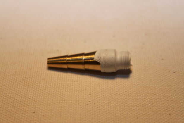 Tomar la punta de la inflación de latón y poner cinta de teflón en las roscas. Sólo necesita utilizar suficiente teflón para ir alrededor de las roscas una vez.