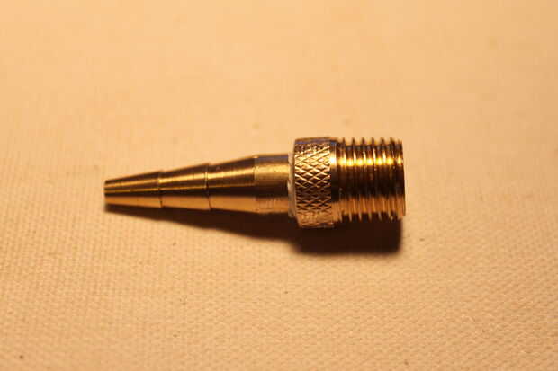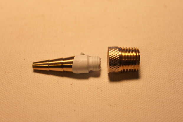 Una vez en la cinta de teflón, tome el adaptador de latón y atorníllelo en su lugar. Atornille el apretado como se pueden con las manos utilizar sus pinzas. Lo consigue tan estrecha como sea posible con los alicates. Tenga cuidado de no rayar el metal aunque. El latón es un metal muy suave así que cuando se utilizan los alicates para apretar asegurarse que se les agarre lo mas ajustado posible. Atornille los lentamente y con fuerza regular.