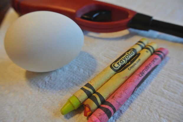 Los materiales son bastante simples. Todo lo que necesitas son algunos crayones viejos, un encendedor, una toalla de papel, pinzas (opcionales) y por supuesto, un huevo.