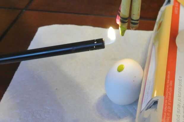Ahora para la diversión parte! Tampoco puede sostener los lápices de colores en los dedos, o si está preocupado por riesgo de quemaduras, que hice, se les pueden mantener con los alicates. También ayuda a tener algo que sostener el huevo contra; He utilizado el cartón de huevo. Una vez tengas todo configurado, sostenga los lápices de colores por encima de su huevo propped para arriba, entonces mantenga el encendedor al lado de las ceras y moverse para distribuir la cera de fusión sobre el huevo.