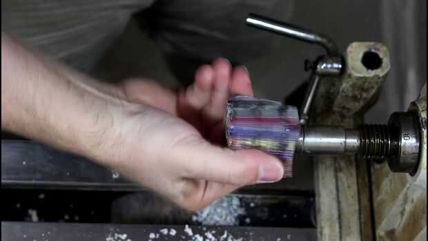 El diámetro del bastidor era un pelo demasiado grande para mi las mordazas del mandril, así que tuve que cortar la botella en un cubo, para poder montar el cubo en el torno y convertirlo nuevamente en un cilindro. Es todo muy técnico... :)
