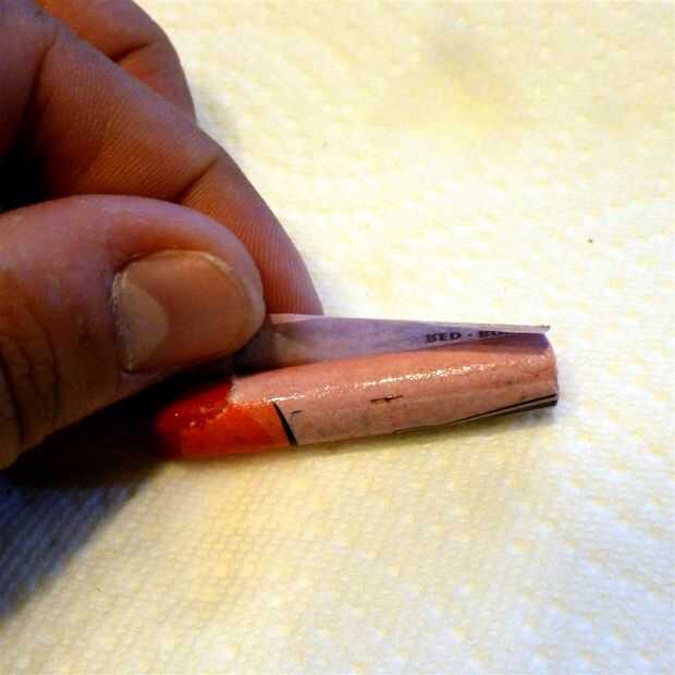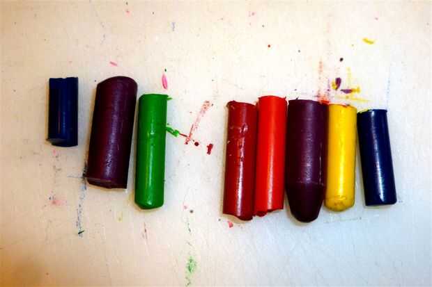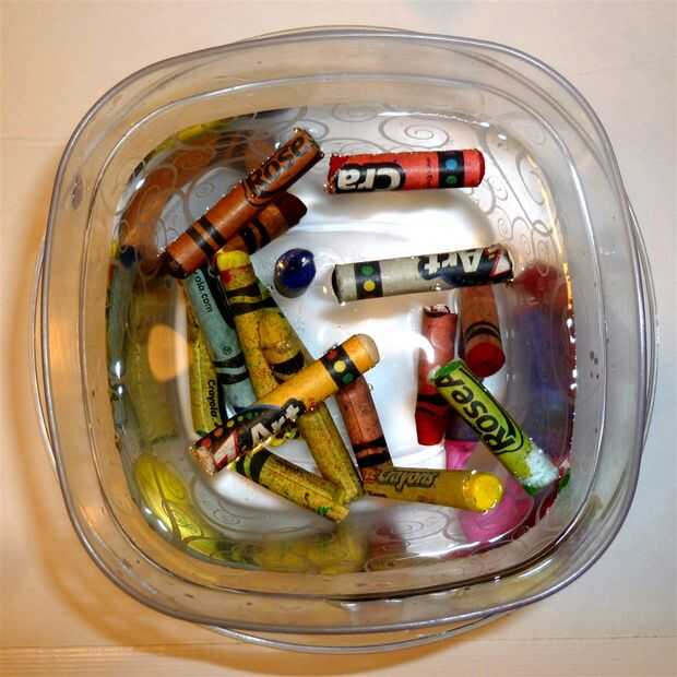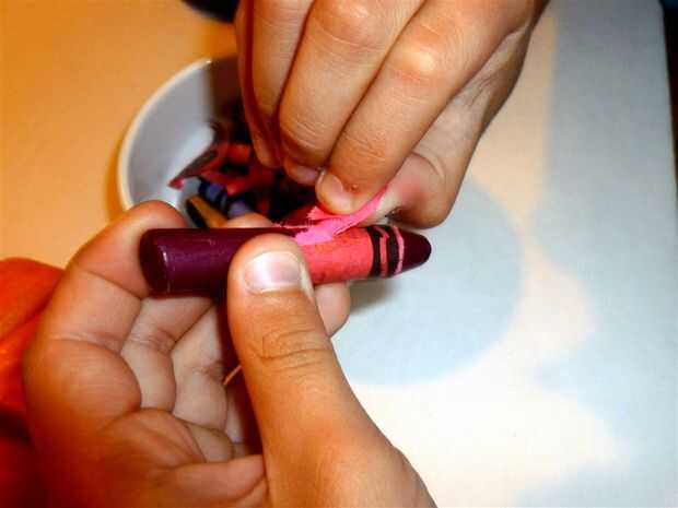 Un blog sugerido Remoje las ceras en agua durante la noche, cosa trató, pero no estaba satisfecho con el resultado. Creo que hubiera sido mejor simplemente sentado allí y peeling. Había una capa delgada de papel que no saldría con este método en algunos lápices de colores. Supongo que es sólo el pegamento usado para mantener el papel en la tiza sí mismo.
