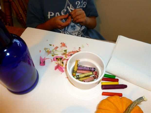 También coloco una nota aquí no para utilizar lápices de colores de tamaño más grandes con los más finos. Los distintos grosores de crayones derretidos en diferentes tasas y mucho calor (como se muestra en el paso siguiente) todos los del goteo de cera color apagado casi totalmente la calabaza.