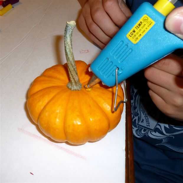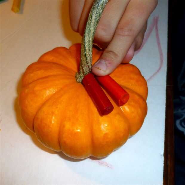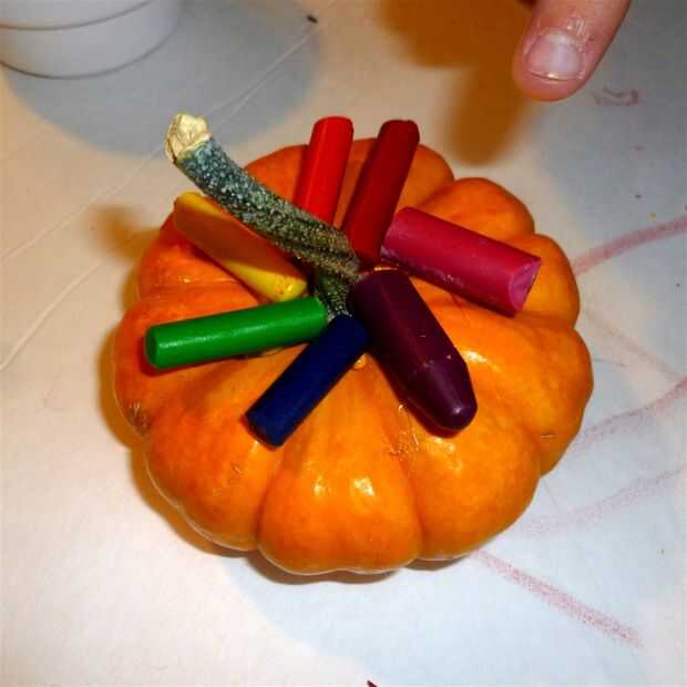 Coloque un lápiz en la mancha de pegamento y apretar hacia abajo durante unos segundos adherir la tiza a la calabaza. Yo no dejaba mis cuatro años hacer esto, pero el niño de siete años apretó sus lápices de colores por sí mismo. El niño de cuatro años me dijo qué colores poner en orden.