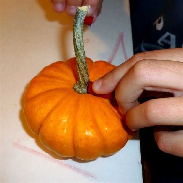 Hacer un anillo alrededor de las calabazas con las puntas de un extremo de la tiza en el tallo.