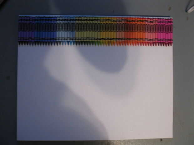 empezar pegar crayones con pistola de pegamento después de clasificar los lápices de colores. mina de izquierda a derecha y pegarlos para que el logo de crayola estaba mostrando como se ve. otra vez cola muy caliente.