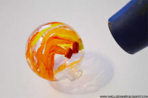3. con la configuración secador de pelo en lo alto, explosión del calor en el ornamento. Encontré que podría manejar el adorno si no tengo el calor demasiado tiempo en un mismo lugar. Giró el ornamento como que gotearon con mi mano. A veces los lápices de colores eran incontrolables.  Esa es la belleza de este proyecto, crea Resumen gotas... sólo tienes que ir con él!
