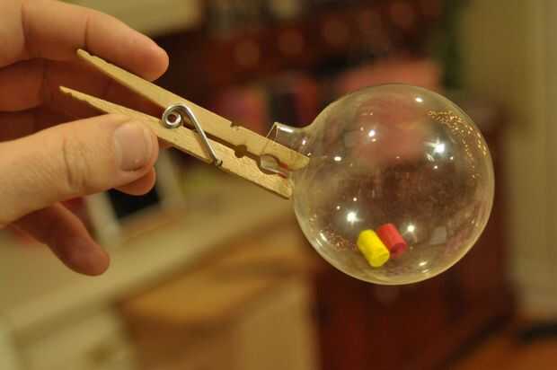 El adorno con la clavija de ropa del gancho agarrador. Alternativamente, podría meter un palillo en un corcho y empujar el corcho dentro de la abertura en el ornamento de un mango extra largo.