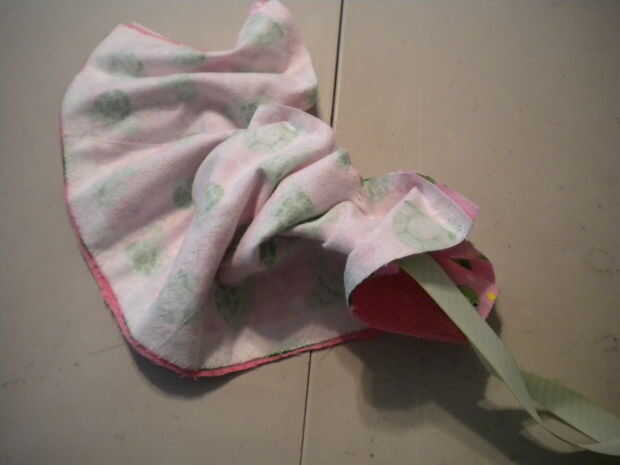 Ahora, utilicé la cinta para tirar Mina de adentro hacia afuera. Una vez que es dado vuelta adentro hacia fuera, puede luego coser el agujero que dejaste y pespuntear en la parte superior del rollo crayones también.