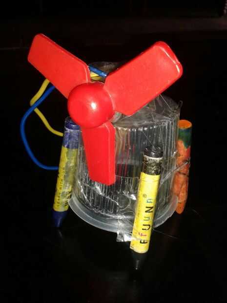 En primer lugar tomar un vaso de plástico y 4 lápices de colores que con la cinta de pegar. Uno de la Copa con cinta pegar un motor D.C y una celda a continuación completan el circuito con los cables.