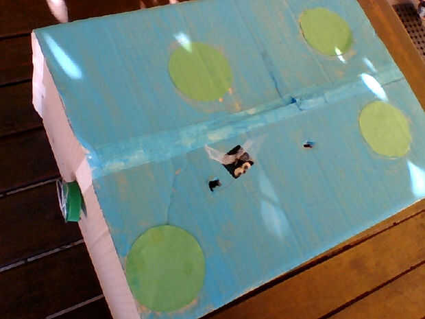 Añadir algún color y detalle en la caja si gustó, hicimos nuestra en un estanque con los cojines del lirio. También pintamos los laterales un color azul morado.
