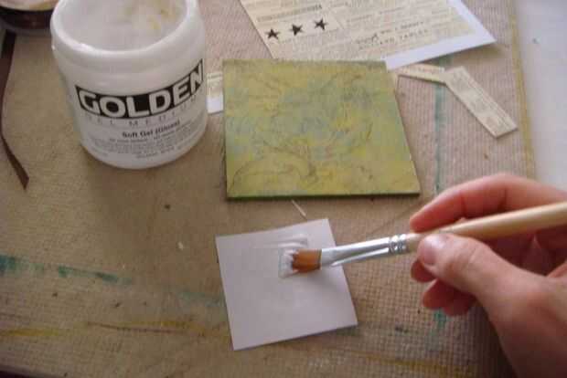 Aplique generosamente Gel suave de oro (Semi-Gloss) a la superficie de la placa de yeso y colocar el papel de fondo recorte encima de la capa de gel. Asegúrese de que las esquinas tienen suficiente cantidad de gel ya que no suelen adherirse muy bien. Una vez que el papel está en su lugar, aplique una cantidad fina de Gel suave de oro a la superficie del papel (creará una agradable textura plana y añadir un poco de brillo). Tarda entre 10-15 minutos para que la superficie a secar lo suficiente así que, usted puede proceder al siguiente paso.
