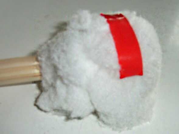 6. pega el extremo de la tira del lacre para el palo, justo por debajo del fieltro / cinta de bola. Envuelva la tira del lacre alrededor del palo hasta que se cubran unos 5-7 cm (2-3) pulgadas del palo.