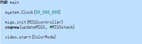 Migs.init(MIGScontroller) empieza el objeto de controlador MIGS utilizando la configuración que hemos asignados a la configuración MIGScontroller en la sección CON nuestro programa. Podríamos haber utilizado migs.init(28) de es mucho mejor para que la configuración disponible en la parte superior de nuestro programa en lugar de obligar a los usuarios buscar el código para ubicar la línea de inicio y cambiar el número. La línea de cognew (updateMIGS, es realmente necesaria para aquellos con migs_wiiclassic.spin en la sección de objeto y puede ser omitido si está utilizando controladores de NES, teclado o N64.