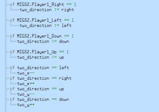 Es mucho como el código de control se utilizó en el último capítulo, excepto que esta vez que sólo cambiamos el valor en el cuadro de byte, "one_direction" cuando se presiona un botón. ¿(Recuerde que los valores de CON donde nos asigna a la derecha, izquierda, abajo y encima de un valor fijo? Si el jugador presiona el botón derecho nos podríamos han dicho, one_direction: = 1, pero no es one_direction: = derecha mucho mejor?)