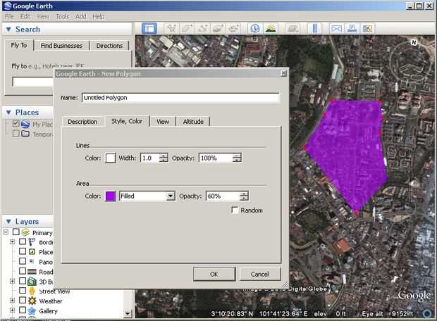 Similar a la adición de marcas de posición, zoom en la zona donde desea superponer un polígono y haz clic en el botón Añadir polígono en la barra de herramientas de Google Earth. Haga clic en el mapa para añadir múltiples puntos que formarán el polígono. Haga clic para quitar los puntos.