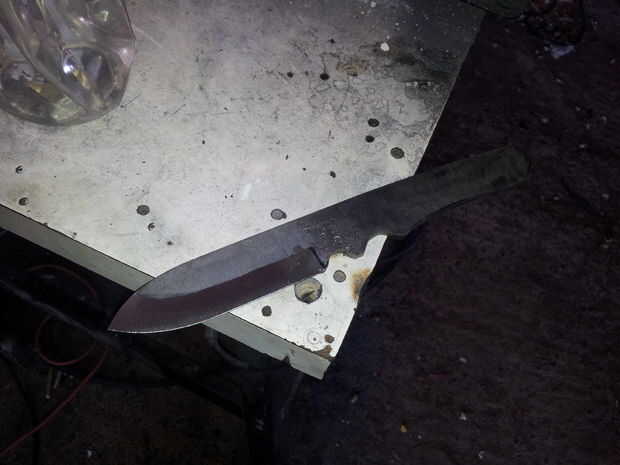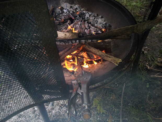 No tener un soplete de oxi-acetileno para facilitar el proceso, he optado por una configuración más simple. Una manera de hacerlo es utilizar dos antorchas de propano, golpear la empuñadura de ambos lados al mismo tiempo, luego subir lentamente el mango hasta llegar a un par de pulgadas de la hoja. Este método es largo y agotador así que utilicé un método mucho más fácil. Construí una fogata, esperada hasta que tenía una base decente de carbón, había hundido el asa en las brasas, luego dio vuelta mi aspiradora de taller en reverso para soplar aire a través de los carbones, haciendo aún más el fuego. Funcionó a la perfección y una prueba rápida de pedernal después aseguró que no había mal estado con el genio en la lámina propia.