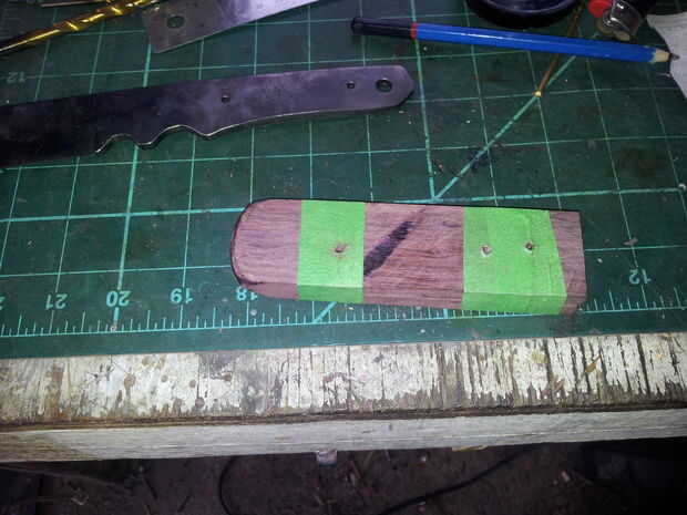 A continuación, capa superior de una capa de cola en las escalas y poner un poco en los orificios donde los pernos se empujan a través de. No te preocupes demasiado si la aprieta pegamento hacia fuera un poco porque usted va ser lijado todo después, sólo intenta no sale nada en la hoja. Es una buena idea para envolver la lámina en cinta para asegurar que se mantiene limpio.