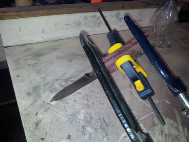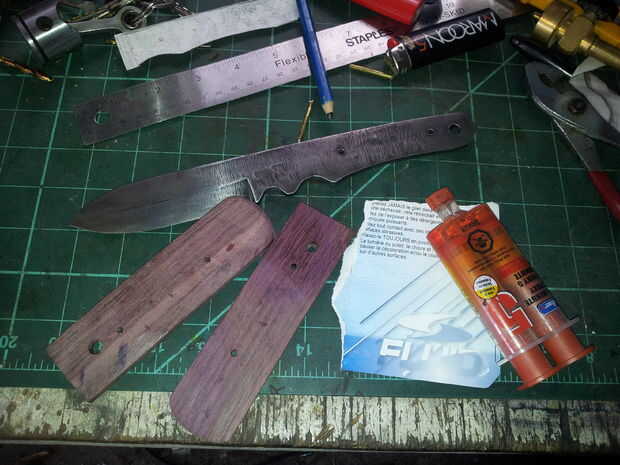 Cuando todas las piezas están listas, sandwich todo juntos, empuje los pernos a través de la que están pegando por ambos lados, luego fije con abrazaderas las escalas a la hoja. Dejarlos reposar un par de horas hasta que el pegamento se seca.