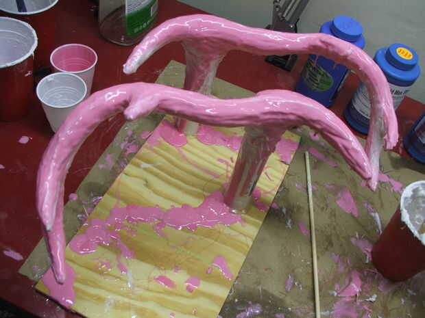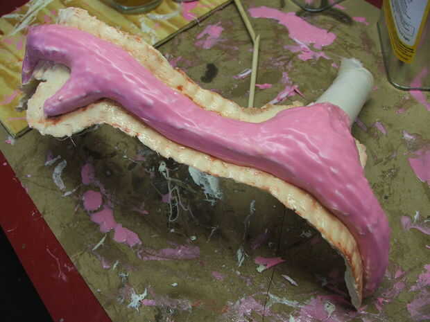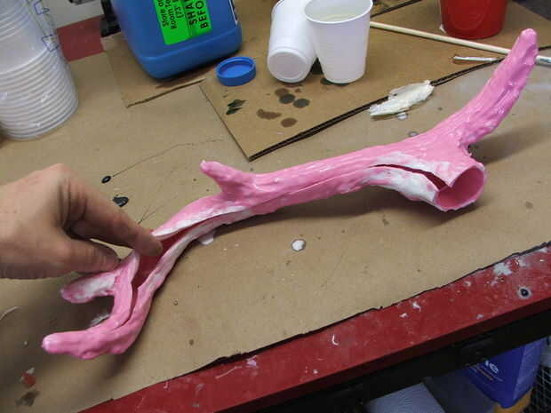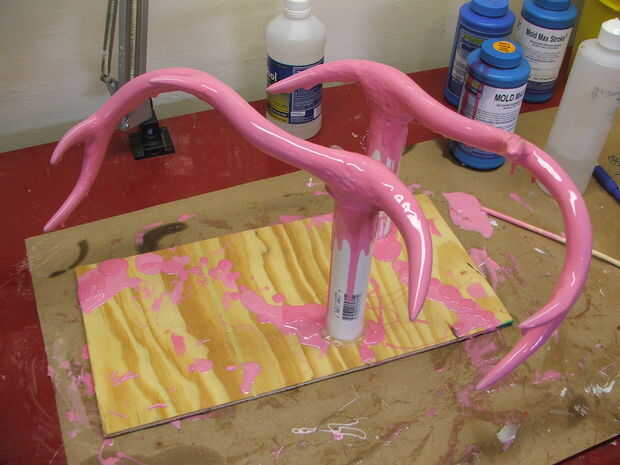 Después de anclar sus cuernos esculpidos a la base con pegamento caliente y longitud de PVC, pintar una fina capa de silicona sobre la pieza entera y dejar para curar durante unos 45-60 minutos antes de agregar una capa de seguimiento (Foto 2). Para éstos, usé Smooth-On Mold Max 30 y siliconas Mold Max Stroke. Construir grueso hasta que tus moldes son de. 25" de espesor, luego les permite curar por 24 horas (Foto 3).