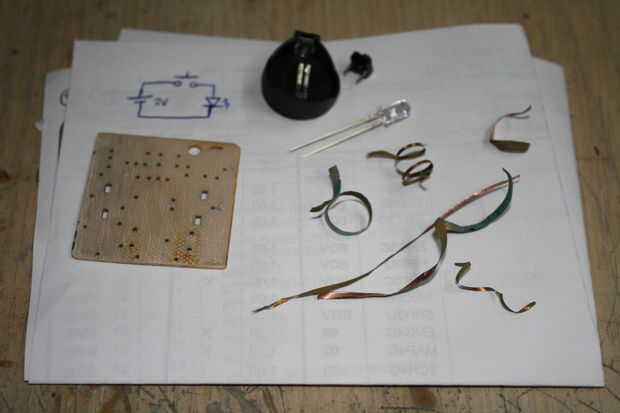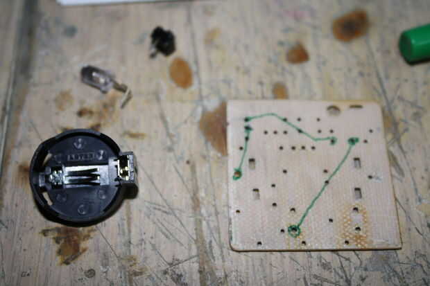 Le dan unos minutos para secar y usar un alfiler para empujar los agujeros en el cobre que reveló los agujeros que estamos utilizando. Si lo desea, puede perforar los orificios necesarios en este paso.