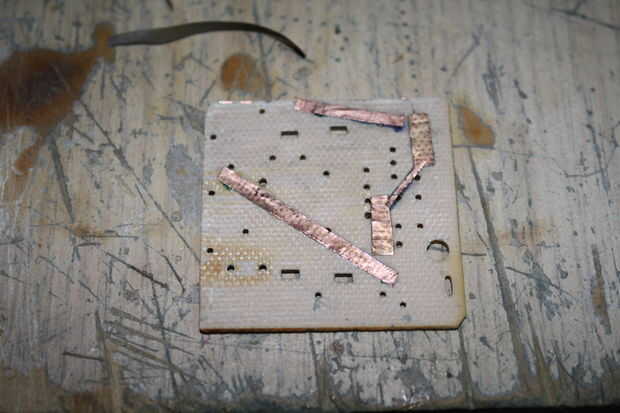 A continuación algunos de los rastros cortamos al tamaño requerido para cubrir las líneas y aplicar pegamento a lo largo de las líneas dibujadas (I sugest haciendo una pista del segmento como un tiempo) entonces coloque los rastros hacia abajo y les liso tanto como puedas antes de que se seque. Trato y encubrir tanto de las líneas dibujadas como sea posible, esto asegura que se están haciendo correctamente y parece más ordenado. También aseguro que sobreponga el orificio de un mm o 2.