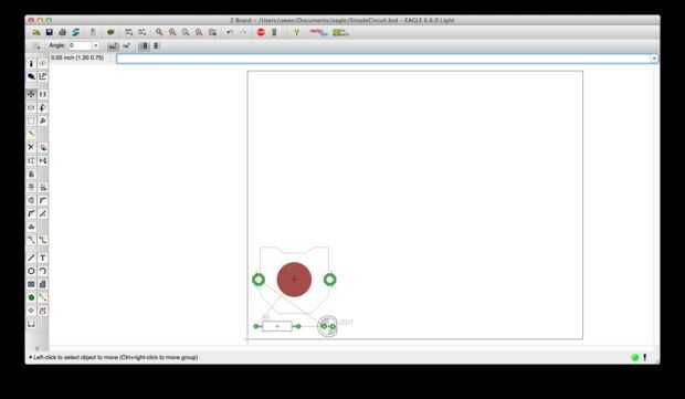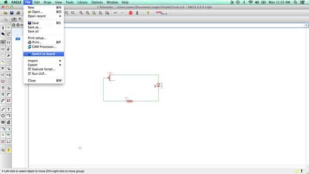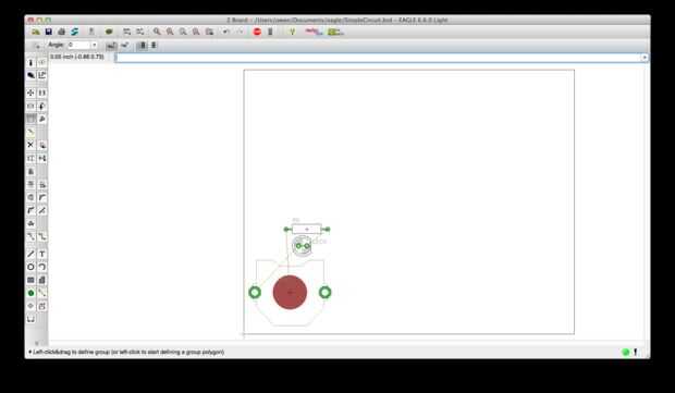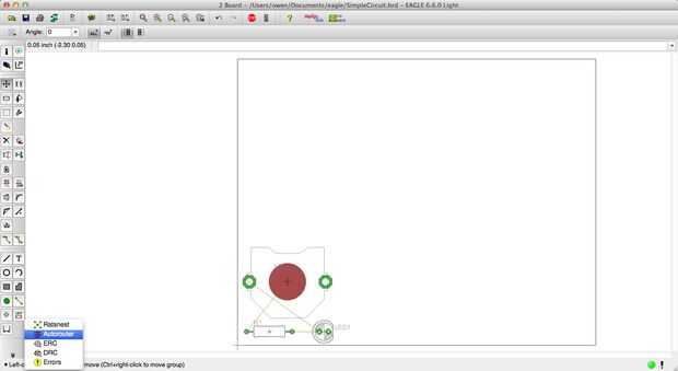 Ahora tienes dos opciones. Cualquiera puede dibujar manualmente rastros entre sus componentes, o puede dejar que EAGLE lo haga automáticamente por usted. Porque usted tomó el tiempo para dibujar un esquema primero, águila sabe lo que está conectado a qué. Vamos a tratar de hacerlo automáticamente.
