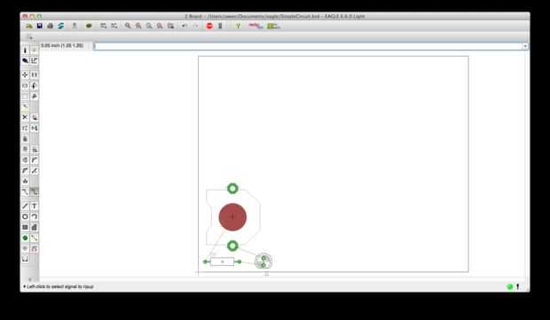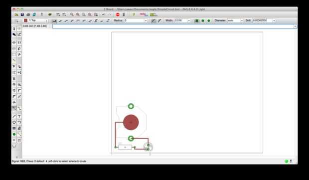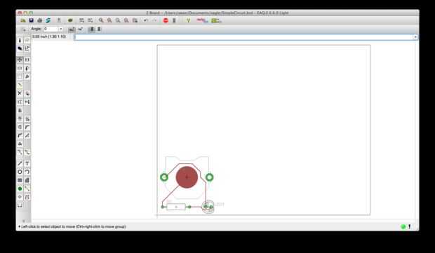Ahora hay rastros rojo oscuros entre todo! Si usted arregla las cosas como lo hicimos, hay un pequeño problema: el rastro que va desde el terminal positivo de la batería el LED pasa por donde va la batería. El símbolo no demuestran completamente, pero el lado negativo de la batería podría tocar ese rastro y causar un corto circuito, que no queremos.