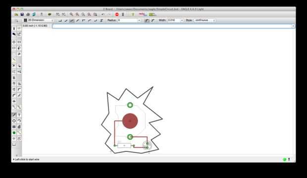 - Seleccione la herramienta de cable y cambiar la capa de "1 Top" a "20 dimensión". La capa de dimensión es lo que Otherplan utiliza para cortar el contorno de la placa.