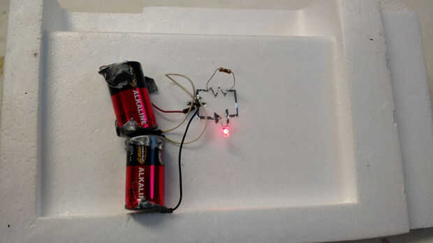 Después de eso, puñalada las patas de los componentes a través de la hoja de la cinta en la espuma y voila! el circuito está completo! Después de un poco de risa floja nuestro circuito trabajó demasiado!