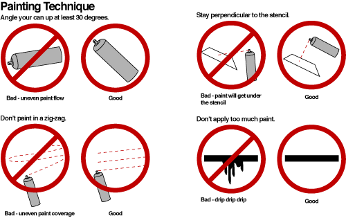 Al pintar un stencil, aplicarán la pintura como lo haría con cualquier otra cosa. El objetivo es conseguir incluso cobertura de pintura, está aplicando la misma cantidad de pintura a cada pedacito de la pieza. Esto ayuda a evitar goteos. Usted quiere pintar con corto, parejos, de 18" de la pieza. No seguir un camino zip zag o tratar de "rastrear" el patrón de la plantilla, en su lugar aplicar pequeños movimientos en una dirección. Esto es así nunca te vuelve a encenderse a sí mismo y golpeó el mismo punto dos veces, porque cuando se gira hacia atrás en su camino con la lata o aerógrafo, aplicar dos veces la pintura en la un punto whrre que dobló-detrás. Asegúrese de que el aerosol en como cerca de un ángulo de 90 grados a la obra como sea posible. Esto ayuda a mantener entonces la plantilla abajo (prevención de exceso de pulverización). También quieren mantener la lata tan vertical como sea posible, que mantiene un bueno y consistente flujo de pintura. Cerca de 45 grados es suficiente. Usted puede inclinar la superficie de trabajo si trabaja dentro para que no te ves obligado a sostenga horizontalmente.