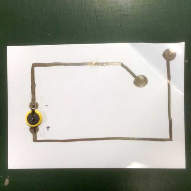 La forma más fácil para hacer un interruptor con materiales Magic es doblar el papel como se muestra en las imágenes. Hacer puntos de contacto seguro (dibujados como círculos grandes en las imágenes) en contacto con cuando se pliega. También, asegúrese de no doblar el papel demasiado porque puede cortar el circuito en el punto de plegado.