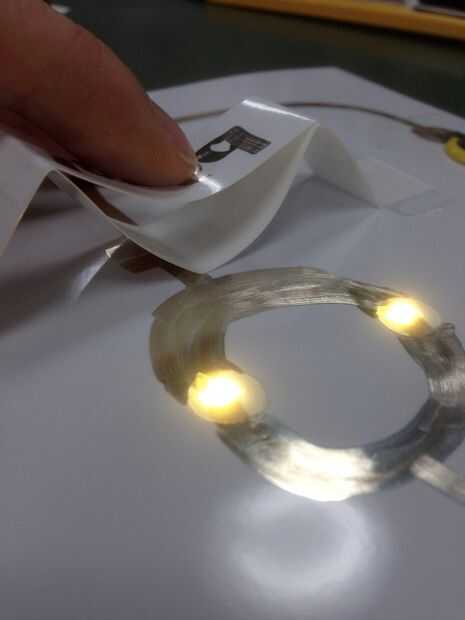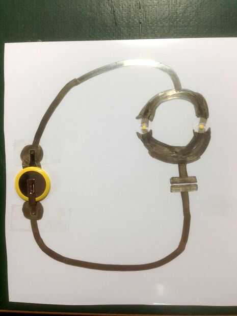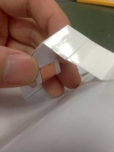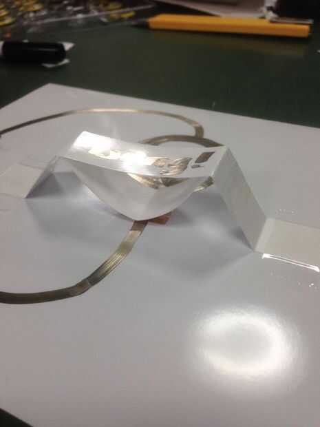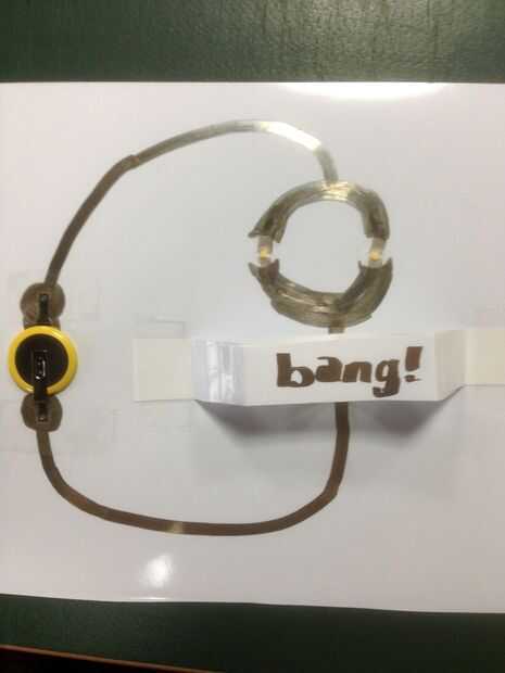 En primer lugar, deje un espacio estrecho en el circuito y hacer que los extremos amplios. Luego realizar un arco como en la imagen 4. Este se compone de dos pedazos de papel. Hacer "M" con uno de ellos y la otra pasta que el punto de empuje (para hacer un puente a "M"). Coloque cinta de cobre en la parte inferior de la "M". La elasticidad del papel hacer este combinado pedazos de papel como un resorte. Utilice scotch para fijar la "M" en el papel que se dibuja el circuito.