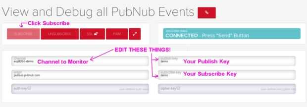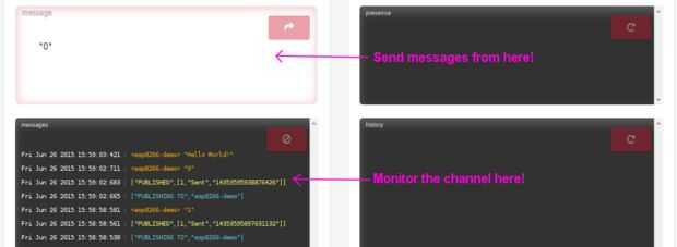 En la consola, escribe en su publicación única y suscribirse las llaves, el canal para escuchar y pulse "Suscribirse". Usted puede entonces enviar mensajes al canal, así como monitorear el canal para todos los mensajes publicados!