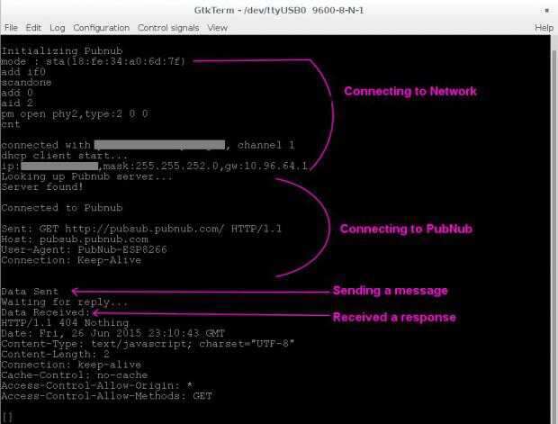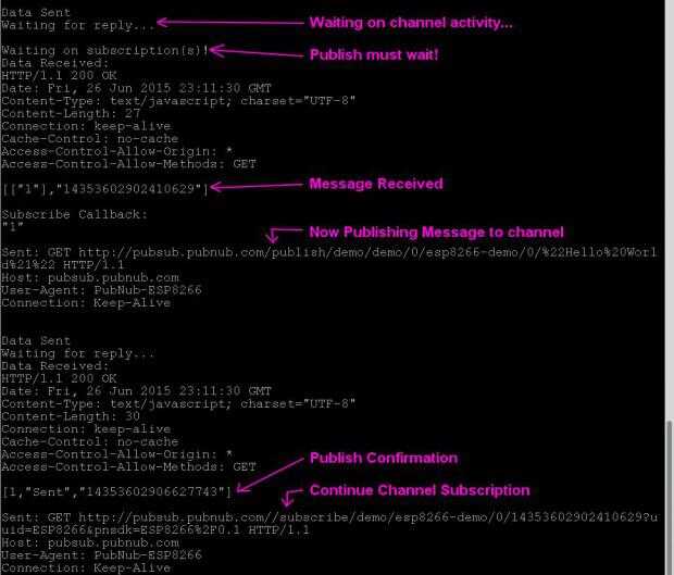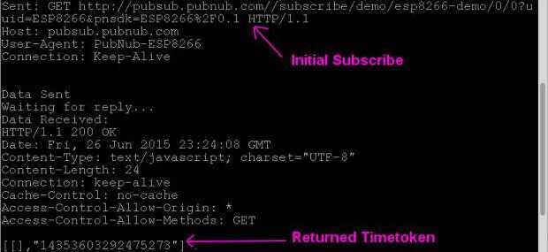 Si se pulsa el botón GPIO0, se realizará una solicitud de publicación. Usted debería ver un mensaje "En espera de suscripciones". La publicación entonces sucederá después de que se recibe el mensaje siguiente o un tiempo de espera ocurre (en aproximadamente 300 segundos). Después del evento de publicar una nueva convocatoria de suscribirse utilizando el Timetoken último se hace otra vez. (Consulte la cuarta imagen).