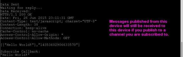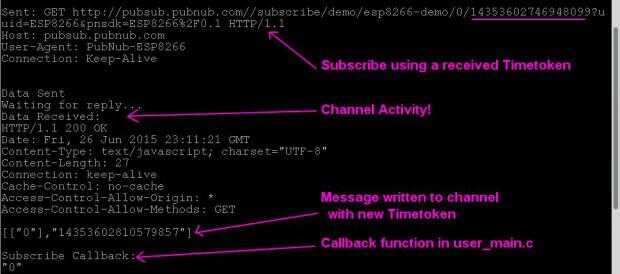 Partir de aquí, cada resonse después una suscripción contendrá un nuevo Timetoken. Esta nueva Timetoken debe utilizarse siempre en la siguiente llamada de suscribirse. Después de una llamada de suscribirse, el programa esperará una respuesta o un tiempo de espera. Cuando se recibe un mensaje, se mostrará y lo definidos por el usuario suscribirse se llamará función de devolución de llamada en user_main.c . (Ver tercera imagen).