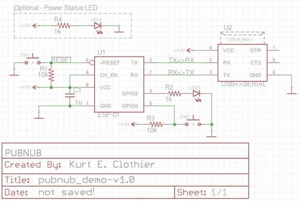La fuente de energía para este proyecto será la real conexión de USB. El USB para módulo Serial debe tener su propio 3.3V regulador que luego podemos utilizar para alimentar el ESP8266. La ESP8266 es no 5V tolerante. No insisto en esta bastante! Usted debe poder que y comunicarse con 3.3V señales, o será un panda muy triste. Con eso PSA fuera del camino, echemos un vistazo en el circuito.