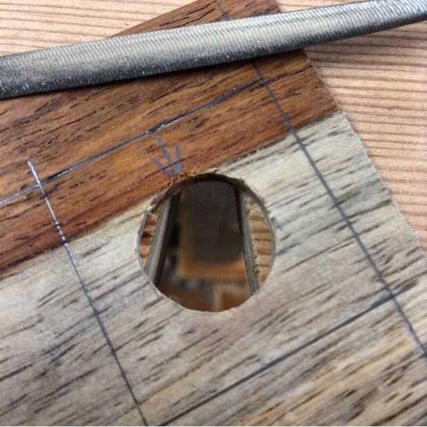 Para hacer el agujero para el primer bit de embutido a sentarse lo, virar los componentes junto con un pequeño punto de pegamento CA y, a continuación, trazar cuidadosamente el perímetro con una navaja. Recalco muy suavemente al principio porque el grano, o fibras de la madera a menudo pueden tirar de la hoja de curso. Cuidadosamente coloque las piezas apartes y luego profundizar un poco más la línea trazada con el cuchillo.