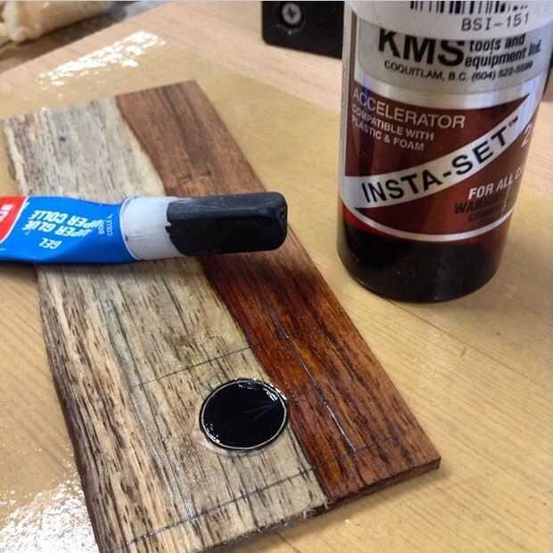 Mi primera pieza de embutido es redondo, así que utilicé un cortador del enchufe de la parte central, luego lo envolvió en filete para los otros colores. Filetes son las tiras de chapa decorativa que rodean guitarras y violines. Yo cuidadosamente con pegamento CA, conocido también como pegamento, les pegan.