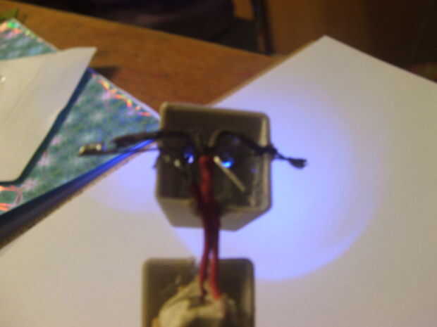 En su cabeza me torcí los cables negativos juntos y los cables de positivo fueron a cada lado (son el pegarse hacia fuera de las cosas) y fueron soldados a un pequeño trozo de cable de altavoz. Estos fueron soldados a los cables de la batería respectivamente.