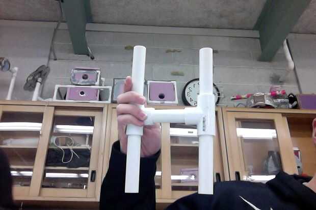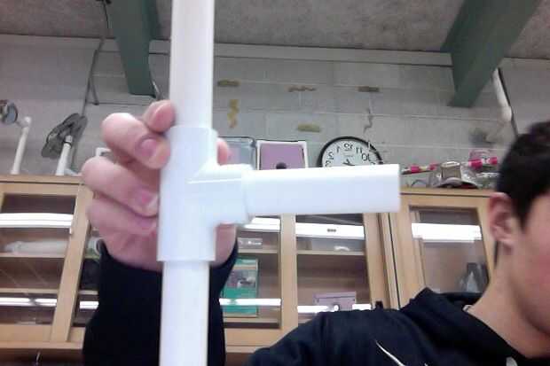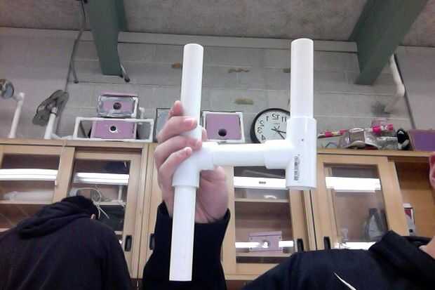 para comenzar el montaje del H primero tomé uno de los tubos de PVC de 4 pulgadas y colocado en el conector T. Luego tomó otro tubo de 4 pulgadas y había colocado en el otro lado del conector. Entonces coloqué el tubo de 3 pulgadas en el conector para conectar ambos conectores de T. Por último, coloqué los restantes tubos de 4 pulgadas en los orificios vacíos en el conector T para crear una carta de PVC que parece una mayúscula H.