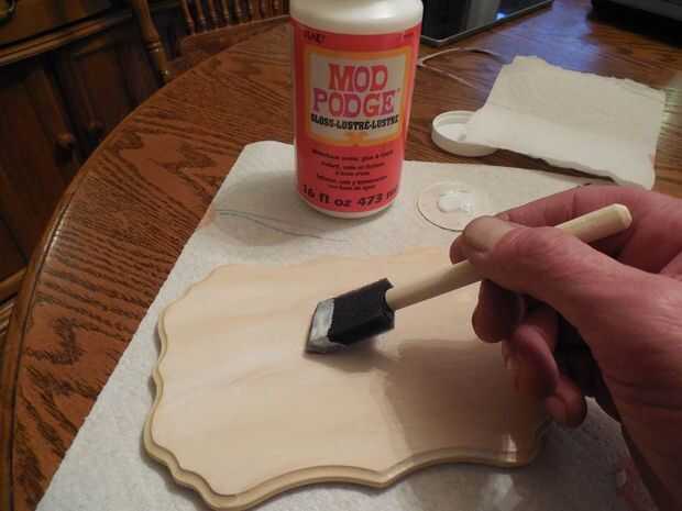 Tomar su papel de lija y lijar la pieza de madera para quitar cualquier área irregular y que lisa. Luego tomar la pouge mod y un cepillo y aplicar una capa uniforme sobre la pieza de madera, asegúrese de que no cualquier charcos. Se trata de la primera capa de 4.