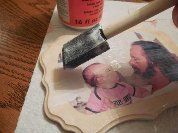 Después de que cuadro es imbeded en madera tomar pouge cepillo y mod y aplicar una capa uniforme sobre madera y fotografía. Esta es la primera capa, esperar 15 a 20 minutos para aplicar otra capa encima intire proyecto. Aplicar 2 manos más encima intire proyecto espera 15 a 20 minutos entre capa y capa. Después última capa deja secar por unas horas dependiendo de la temperatura, proyecto estará listo para disfrutar. Si wraping regalo deje secar durante la noche para dejar secar totalmente.