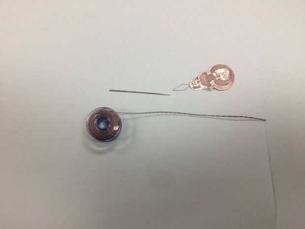 Hilo conductores hilo en tu aguja. Necesita aproximadamente 1' de hilo. Doble el hilo largo y nudo firmemente.
