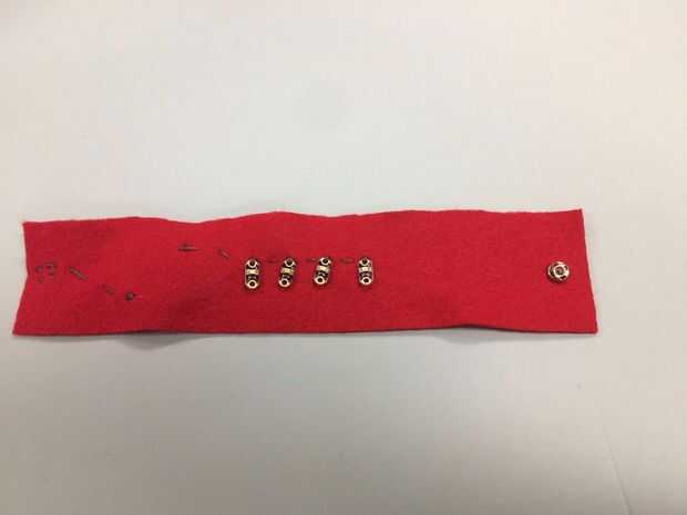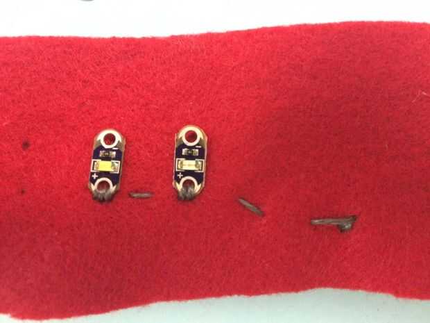 Voltee la tira de fieltro y alinee su LED en el fieltro. Asegúrese de que los LEDs se colocan de la misma manera (y los terminales positivos alineados del mismo lado). Continuar su puntada desde el terminal positivo a través de cada una de las 3 o 4 luces. Cada vez que un bucle por un LED, no se olvide de recorrer las terminal 2 o 3 veces y asegúrese de que esté bien apretada.