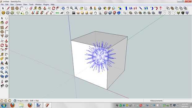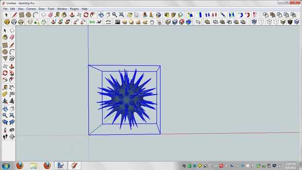 Ahora, para hacer rodajas de la misma, necesitamos hacer el modelo algo más, o bien las rebanadas sería del virus sí mismo. Por supuesto puede hacerlo así, pero para este proyecto nos va cortar el virus fuera algo más para que se vea como que se congela en el acrílico. Para hacer esto, saqué una caja de 5 "x 5" x 5" alrededor de él. Hay muchos recursos de sketchup por ahí, pero esencialmente dibujó una base cuadrada y utiliza la herramienta de empuje darle volumen. En este lugar, me trasladé el modelo en la caja, tratando de centrarlo lo mejor que pude, como se puede ver en la segunda foto.